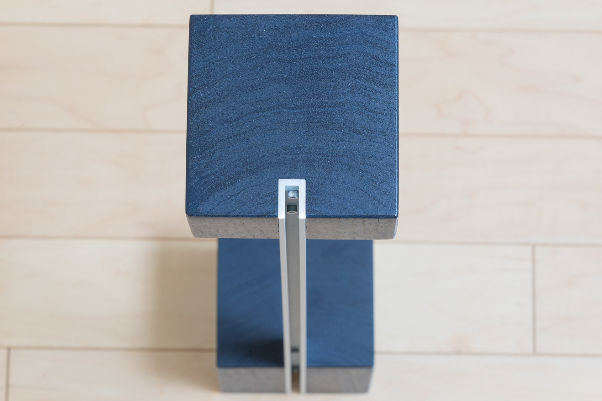 The pieces are then fixed by a satin anodized aluminum extruded channel. A blue Articidol dye was applied to accentuate the pores of the wood in contrast to the machined lines of the channel.